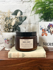 Bougie éco-responsable avec mèche en bois au doux crépitement.