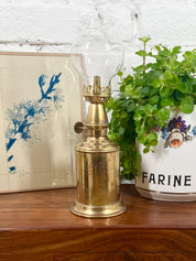 Très bon état général, globe intact, mèche non utilisable, ressoudée à l'anse, ce qui lui donne tout son charme !